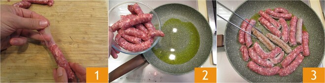 Para preparar linguiça e batatas na cerveja, retire a pele da linguiça 1 e corte em pedaços de 4 cm. Doure a linguiça na frigideira em fogo médio com 20 g de óleo 2. Doure de todos os lados 3.