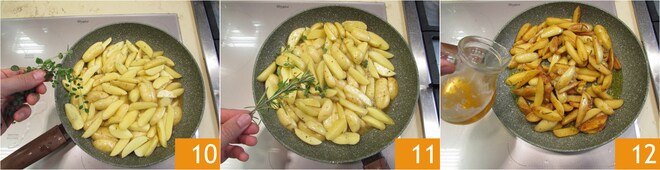 Tempere com orégano 10 e alecrim 11 e mais 20 g de óleo. Quando as batatas estiverem douradas, adicione a cerveja restante 12 e deixe reduzir.