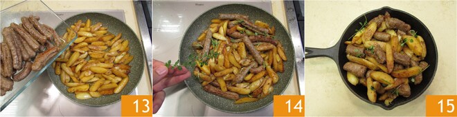 Junte a linguiça na frigideira 13 e continue cozinhando por mais 5 minutos. Com o fogo desligado, adicione mais alecrim e orégano 14. Sirva imediatamente linguiça e batatas na cerveja 15.