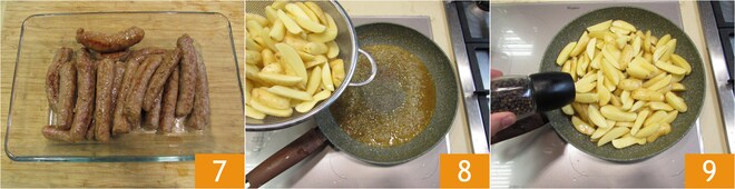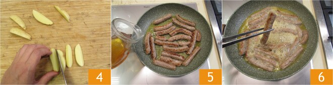 Descasque e corte as batatas em pedaços. Após dourar a linguiça por 10 minutos, adicione 200 g de cerveja 5 e aumente o fogo. Continue cozinhando por mais 5 minutos na frigideira e, assim que a cerveja reduzir, retire a linguiça da frigideira 6.