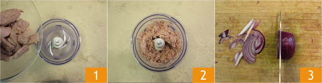 Para preparar as linguine ao creme de atum, coloque o atum escorrido no processador 1 e bata até ficar fino 2. Descasque e fatie a cebola roxa 2.