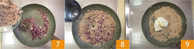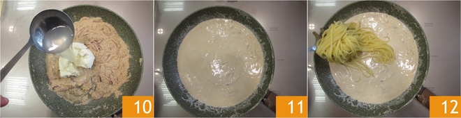 Salgue as cebolas refogadas, adicione o atum triturado 8 e misture tudo. Cozinhe por alguns minutos. Adicione uma concha de água do cozimento da massa 8 e o queijo cremoso 9.