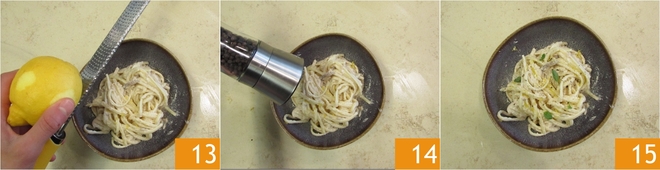 Sirva as linguine ao creme de atum bem quentes, temperando os pratos com raspas de limão 13, pimenta-do-reino 14 e orégano fresco 15.
