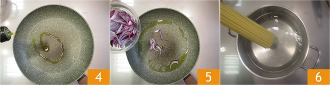 Aqueça um fio de azeite em uma frigideira grande 4, adicione a cebola 5 e refogue em fogo baixo. Cozinhe as linguine em bastante água salgada 6.