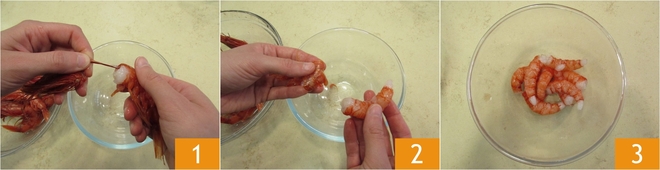 Para preparar a linguine com camarões, abobrinha e açafrão, comece limpando os camarões vermelhos: destaque a cabeça do corpo 1, retire as cascas 2 e extraia o intestino, em seguida, reserve-os em uma tigela 3. Guarde os resíduos que você usará para o caldo.