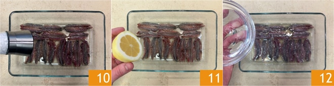 Coloque as anchovas em uma assadeira, ajuste o sal 10, regue com o suco de limão 11, adicione água até cobri-las totalmente 12. Deixe marinar por 10 minutos.