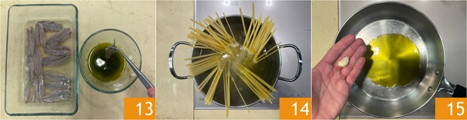Retire as anchovas da primeira marinada e mergulhe-as na citronette 13. Enquanto isso, cozinhe as linguine em água fervente com sal 14. Em uma frigideira, despeje um fio de óleo e adicione o alho 15, deixando dourar por alguns minutos.