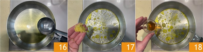 Retire o alho e despeje uma concha de água do cozimento da massa 16, adicione um pouco de casca de limão ralada 17 e um fio de colatura de anchovas 18.