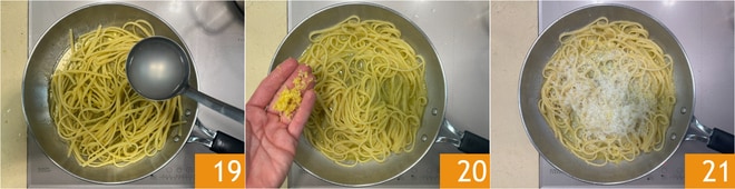 Escorra as linguine e coloque-as na frigideira, despeje uma concha de água do cozimento da massa 19. Adicione o restante da casca de limão ralada 20, o pecorino 21 e misture até obter um molho cremoso.