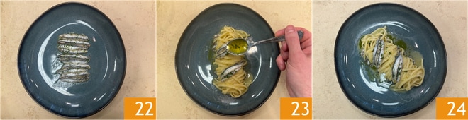 Emprate dispondo no prato 5 anchovas marinadas 22, um ninho de linguine distribuídas, o molho cremoso e complete colocando na superfície da massa mais duas anchovas marinadas e um fio de citronette 23. As linguine com anchovas marinadas e pecorino estão prontas para serem degustadas 24.