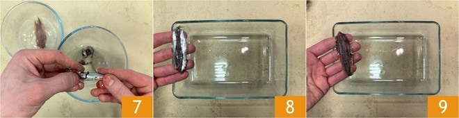 Agora, dedique-se à limpeza das anchovas. Pegue a cabeça entre os dedos, na altura das brânquias 7, exercendo uma leve pressão, retire-a puxando-a. Durante esta operação, você eliminará a cabeça, espinha e vísceras 8. Abra as anchovas ao meio e enxágue para eliminar todas as impurezas 9.