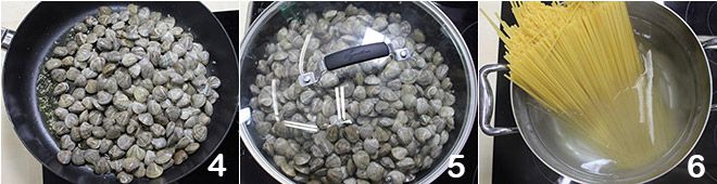 Quando o alho estiver pronto, adicione as amêijoas 4 e cubra com uma tampa para que abram (serão necessários poucos minutos) 5. Enquanto isso, leve uma panela com água salgada para ferver e cozinhe as linguine, depois escorra al dente 6.
