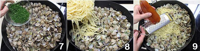 Quando as amêijoas estiverem abertas, adicione a salsa picada 7 e a massa escorrida al dente 8, depois acrescente a bottarga de tainha ralando-a diretamente sobre a massa 9. Misture bem para incorporar todos os ingredientes, desligue o fogo e suas linguine com bottarga e berbigão estão prontas para serem servidas à mesa.