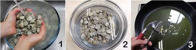 Para preparar as linguine com bottarga e berbigão, comece preparando as amêijoas: limpe-as descartando aquelas com a concha quebrada, depois enxágue repetidamente em água corrente fria 1. Agora coloque as amêijoas em uma peneira grande que deve ser imersa em uma bacia cheia de água, por cerca de meia hora, para permitir que soltem eventuais impurezas 2. Após o tempo necessário, escorra bem as amêijoas e reserve, depois doure dois dentes de alho esmagados em uma frigideira antiaderente com três colheres de sopa de azeite de oliva extravirgem 3.
