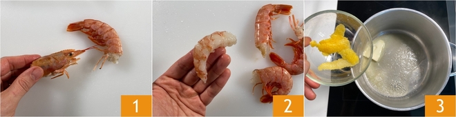 Para preparar as linguine com camarões grandes, tomatinhos e limão, a primeira coisa que deve fazer é cuidar da Como limpar os camarões. Retire a cabeça 1, mas reserve-a porque será utilizada para o bisque. Remova o carapaça, o intestino e retire a polpa 2, depois reserve. Para o bisque, derreta a manteiga em uma panela, adicione a casca de limão 3.