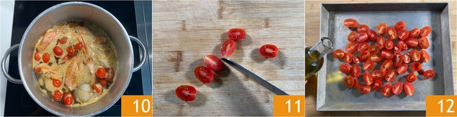 Uma vez pronto 10, coe e mantenha aquecido. Enquanto isso, prepare os tomatinhos confit. Corte os tomatinhos ao meio 11, coloque-os em uma assadeira com o lado cortado para cima. Tempere com óleo 12.