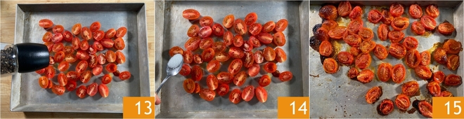 Continue com sal e pimenta 13. Adicione também o açúcar 14 e asse em forno ventilado a 250°C por 10 minutos 15. Reserve os tomatinhos assados.