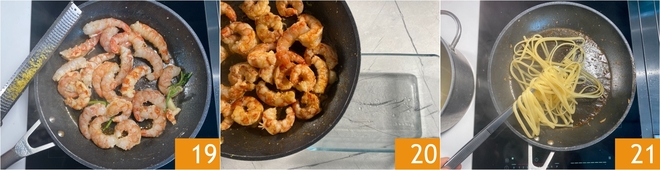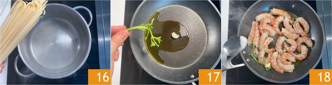 Cozinhe a massa em água fervente com sal 16. Enquanto isso, em uma frigideira, aqueça um fio de óleo, adicione o alho e os talos de manjericão 17. Adicione os camarões grandes 18.