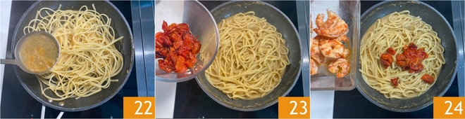 Finalize o cozimento adicionando o bisque, uma concha de cada vez 22, até que a massa esteja al dente. Adicione os tomatinhos confit 23 e os camarões 24.