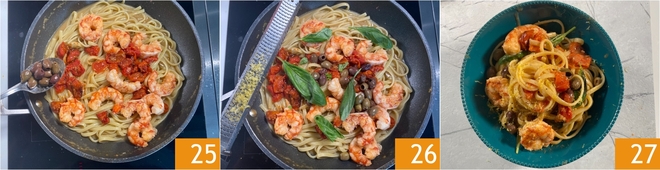 Continue com as azeitonas taggiasche 25, algumas folhas de manjericão e uma pitada de casca de limão 26. Suas linguine com camarões grandes, tomatinhos e limão estão prontas para serem degustadas 27!