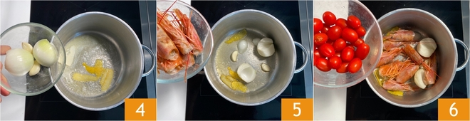 Adicione o alho, a cebola cortada ao meio 4, as cabeças dos camarões grandes 5 e os tomatinhos 6.