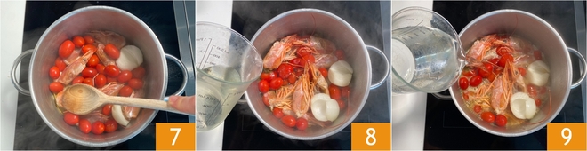Esmague as cabeças 7, mantendo o fogo alto. Regue com vinho branco 8 e deixe o álcool evaporar. Cubra com água 9 e cozinhe em fogo médio por 30 minutos.