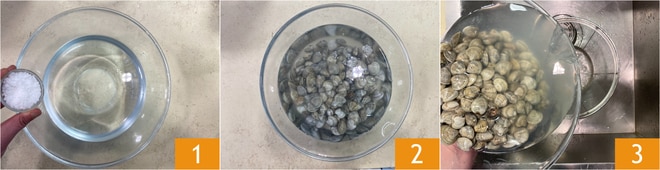 Para preparar as linguine com vôngoles e pimentões cruschi comece purgando os vôngoles que você terá deixado de molho por uma hora em uma tigela com água fria e sal grosso. Dose o sal considerando que deve corresponder a 10% da quantidade de água 1 2. Após o tempo de purga, escorra os vôngoles 3.