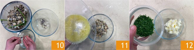 Agora reúna os frutos em uma tigela e elimine as conchas vazias 10; é muito importante eliminar também os vôngoles que permaneceram fechados após o cozimento porque estão cheios de areia. Cubra os frutos com uma pequena parte da água de cozimento, assim não secarão 11. Coloque os vôngoles na geladeira e cuide da manteiga de salsinha: pique finamente apenas as folhas de salsinha e junte-as à manteiga cortada em cubos que você deixou em temperatura ambiente por cerca de 30 minutos 12.