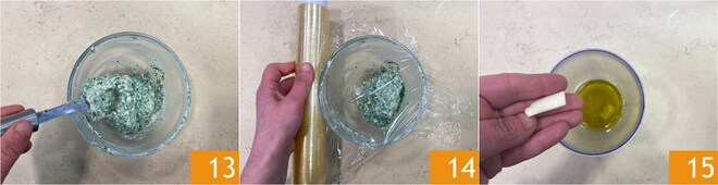 Misture bem com uma espátula para integrar a mistura 13, depois cubra com plástico filme e coloque na geladeira 14. Continue com o óleo de alho: em um recipiente estreito e alto, coloque o azeite de oliva e o dente de alho, que você terá descascado e retirado o germe interno 15.
