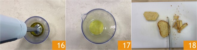 Bata com o mixer de imersão 16 para obter um molho homogêneo 17 e reserve. Agora pegue o pão amanhecido e retire a casca 18.