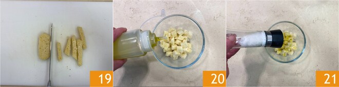 Corte o miolo em cubos 19, transfira para uma tigela e tempere com um fio de azeite 20 e sal 21.