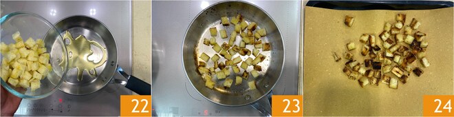 Toaste o pão em uma frigideira com um fio de azeite de oliva 22. Quando estiverem dourados e crocantes 23, transfira os cubos de pão para uma bandeja forrada com papel absorvente para secar o excesso de óleo 24.