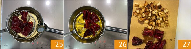 Agora passe à preparação dos pimentões cruschi: aqueça o óleo de sementes em uma panela até a temperatura de 150°, depois mergulhe os pimentões cruschi usando uma espumadeira 25, o cozimento deve ser muito rápido, caso contrário, eles absorvem o óleo e ficam amargos. Escorra-os assim que se abrirem 26 e coloque-os na mesma bandeja com papel absorvente onde você também colocou os cubos de pão 27.