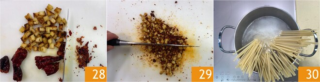 Depois de esfriar, triture juntos os pimentões cruschi e o pão 28 para obter migalhas 29. Reserve e cozinhe as linguine em água fervente e salgada 30.