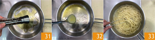 Enquanto isso, em uma panela, aqueça um fio de azeite com a pimenta-do-reino moída 31, dilua o tempero com uma concha de água de cozimento dos vôngoles 32 e aqueça bem. Depois de 5 minutos, escorra as linguine e coloque-as diretamente na panela 33. Ajuste o sabor adicionando água de cozimento da massa, se já estiver bem temperada, ou a água de cozimento dos vôngoles se estiver um pouco insípida.