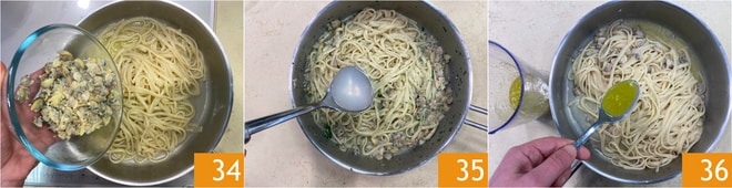 Quando faltar um minuto para o término do cozimento, adicione também os vôngoles 34, depois desligue o fogo e complete o tempero com mais água de cozimento, se necessário 35. Espere alguns instantes, depois tempere com uma colher e meia de óleo de salsinha 36.