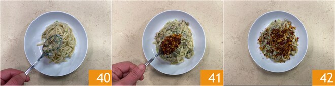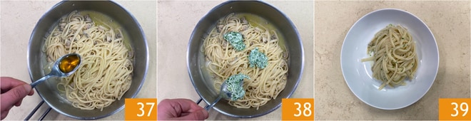Adicione uma colher de colatura de anchovas 37 e a manteiga de salsinha fria da geladeira 38. Finalize com um fio de óleo e misture bem a massa para deixá-la cremosa. Sirva imediatamente as linguine 39.
