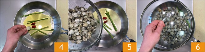 Em uma panela, coloque um fio de azeite de oliva, os talos de salsinha, um dente de alho com casca e a pimenta cortada ao meio 4. Deixe pegar sabor até que o óleo esteja bem quente, então adicione os vôngoles 5 e cubra imediatamente com a tampa 6.