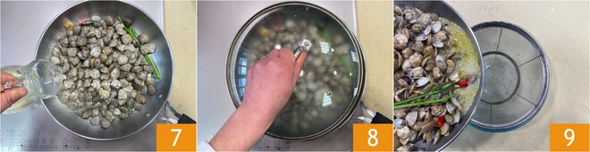 Depois de cerca de um minuto, adicione o vinho branco 7, cubra novamente com a tampa 8 e deixe cozinhar por cerca de 2-3 minutos para que se abram. Neste ponto, desligue o fogo e escorra os vôngoles usando uma peneira, coletando o líquido de cozimento em uma tigela 9; será usado mais adiante na preparação.