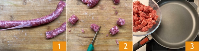 Para preparar as linguine com linguiça, alho-poró e funcho, a primeira coisa é remover a tripa da linguiça 1 e cortá-la grosseiramente em pedaços 2. Coloque a linguiça em uma frigideira antiaderente bem quente e doure-a 3.