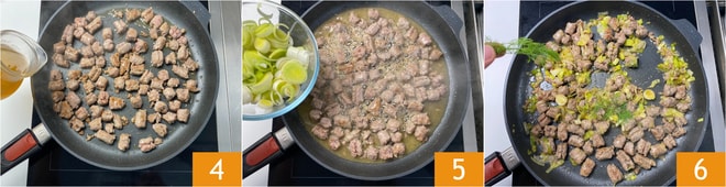 Deglaceie com a cerveja 4 e deixe evaporar a parte alcoólica, depois adicione o alho-poró cortado em rodelas 5 e o funcho 6. Continue cozinhando por cerca de dez minutos, até que o alho-poró esteja dourado.