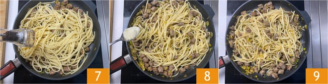 Enquanto isso, cozinhe as linguine em água fervente salgada. Escorra a massa al dente e transfira para a frigideira. Apimente 7, adicione o Parmigiano Reggiano DOP ralado 8 e salteie brevemente. As suas linguine com linguiça, alho-poró e funcho estão prontas para serem degustadas 9!