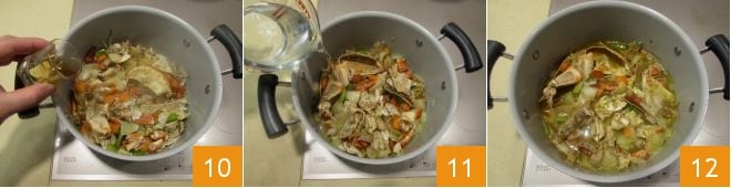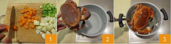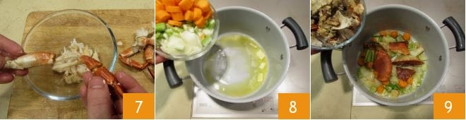 Torce as pernas uma de cada vez com um movimento firme na direção oposta àquela que estão orientadas para destacá-las e extraia a carne escondida dentro 7. Reserve os restos, pois serão úteis. Em uma panela, derreta a manteiga e adicione o óleo 8. Junte os vegetais cortados grosseiramente e refogue por 5 minutos. Adicione os restos de siri 9,