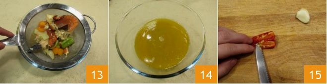 Quando estiver pronto, coe tudo com a ajuda de uma peneira fina 13 e reserve 14. Corte a pimenta ao meio e elimine as sementes internas 15.