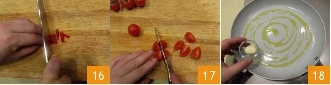 Pique finamente 16 depois lave os tomatinhos e corte-os em 4 partes 17. Refogue um dente de alho em uma frigideira antiaderente com um fio de azeite 18;