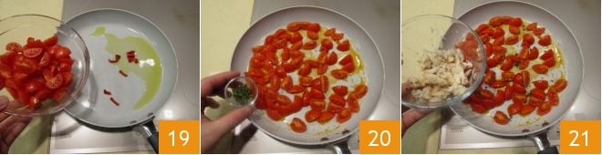 retire o alho e adicione a pimenta e os tomatinhos 19, ajuste de sal e pimenta e adicione o tomilho, cozinhando por 10 minutos 20. Despeje na frigideira a carne de siri 21