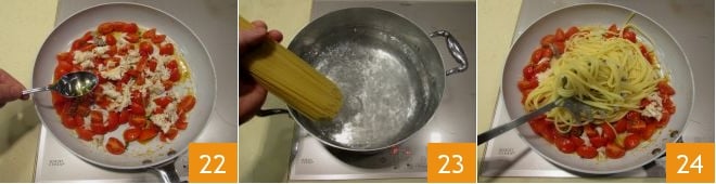 junto com o caldo que você preparou anteriormente 22, misture com uma espátula e desligue. Coloque uma panela com água no fogo, quando ferver, cozinhe as bavettes por 8 minutos, deixando-as al dente 23. Uma vez pronta, escorra a massa e despeje diretamente na frigideira com o molho 24;