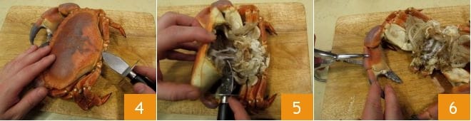 Proceda então à limpeza do siri: com uma faca pequena, retire a nadadeira caudal 4 e separe a parte superior da inferior. Elimine o saco do estômago, as brânquias moles, pois não são comestíveis, 5 e retire a carne macia e cremosa. Abra as garras com um alicate 6 e retire a carne em pedaços grandes.