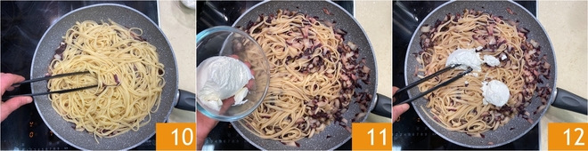 Refogue tudo 10, depois adicione a ricota 11 e misture bem 12. Você deve obter um creme liso e homogêneo; se necessário, adicione mais um pouco da água do cozimento da massa.