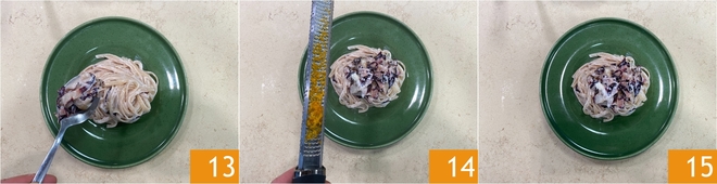 Agora, sirva colocando um pouco de radicchio sobre as linguine 13, depois complete com raspas de laranja 14, pimenta-do-reino moída e um fio de azeite se desejar. As linguine com ricota e radicchio estão prontas, sirva imediatamente 15!